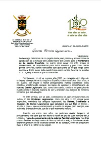 El General Jefe de La Brigada Rey Alfonso XIII II de La Legión, se dirige a la Familia Legionaria