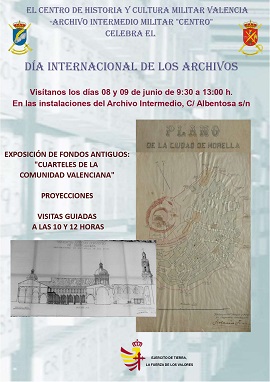 El Archivo Intermedio Militar “Centro” (AIMC), para la celebración del “Día Internacional de los Archivos 2023”, llevará a cabo, en las propias instalaciones del Archivo, dos jornadas de puertas abiertas con exposición de documentos antiguos relacionados con instalaciones militares de la Comunidad Valenciana y visitas guiadas a las instalaciones del propio Archivo.