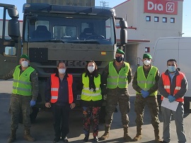 Integrado en la operación Balmis, el Grupo de Abastecimiento I/21 (GABTO I/21) de la Agrupación de Apoyo Logístico nº. 21 realizó el 14 de abril el transporte, en apoyo al Banco de Alimentos de Sevilla, de 11 palés con un total de 7.400 kilogramos de víveres, donados por supermercados DIA, desde la base logística de la cadena en Dos Hermanas hasta la sede operativa de la entidad benéfica en el polígono Store de Sevilla.