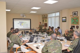 Después de recibir los honores correspondientes, el TG se trasladó hasta la sala de conferencias de la Agrupación, donde el General Jefe de la BRILOG (GEBRILOG), Juan Carlos Olalla Simón, le expuso las conclusiones más importantes de ámbito logístico emanadas de la referida inspección.
